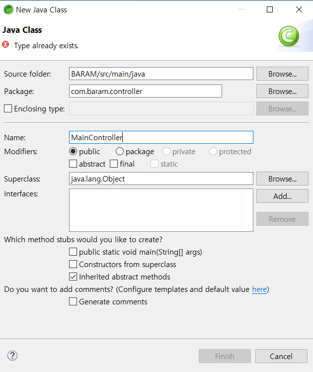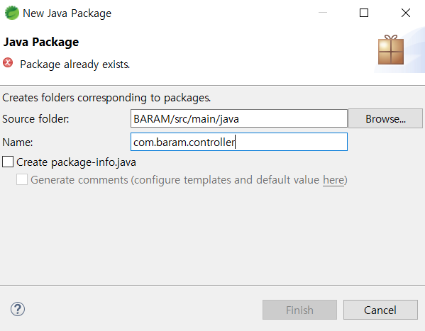 먼저 프로젝트 생성할 때 설정한 package 아래에 controller 패키지 생성