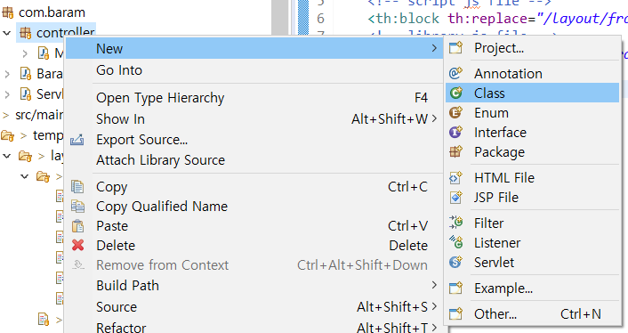 생성한 controller 패키지 마우스 오른쪽 클릭 > New > Class