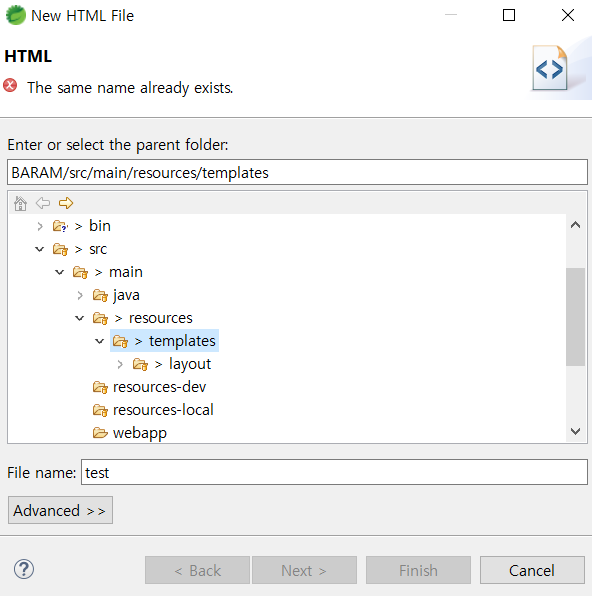 src/main/resources 하위에 templates 마우스 오른쪽 클릭 > new > HTML File > File name에 test 입력