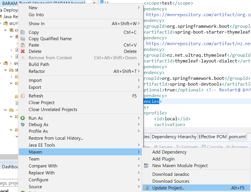 프로젝트 마우스 오른쪽 클릭 > Maven > Update Project...