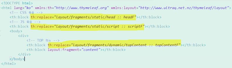 th:replace="" 구문을 통해 따로 분리한 조각인 head.html 파일을 해당하는곳에 교체한다.