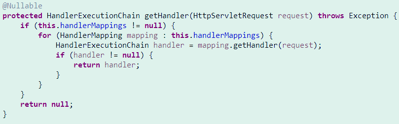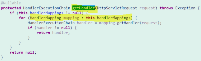 2. getHandler() 메서드를 통해 HandlerMapping 리스트 중 요청에 맞는 Handler 를 가져온다.