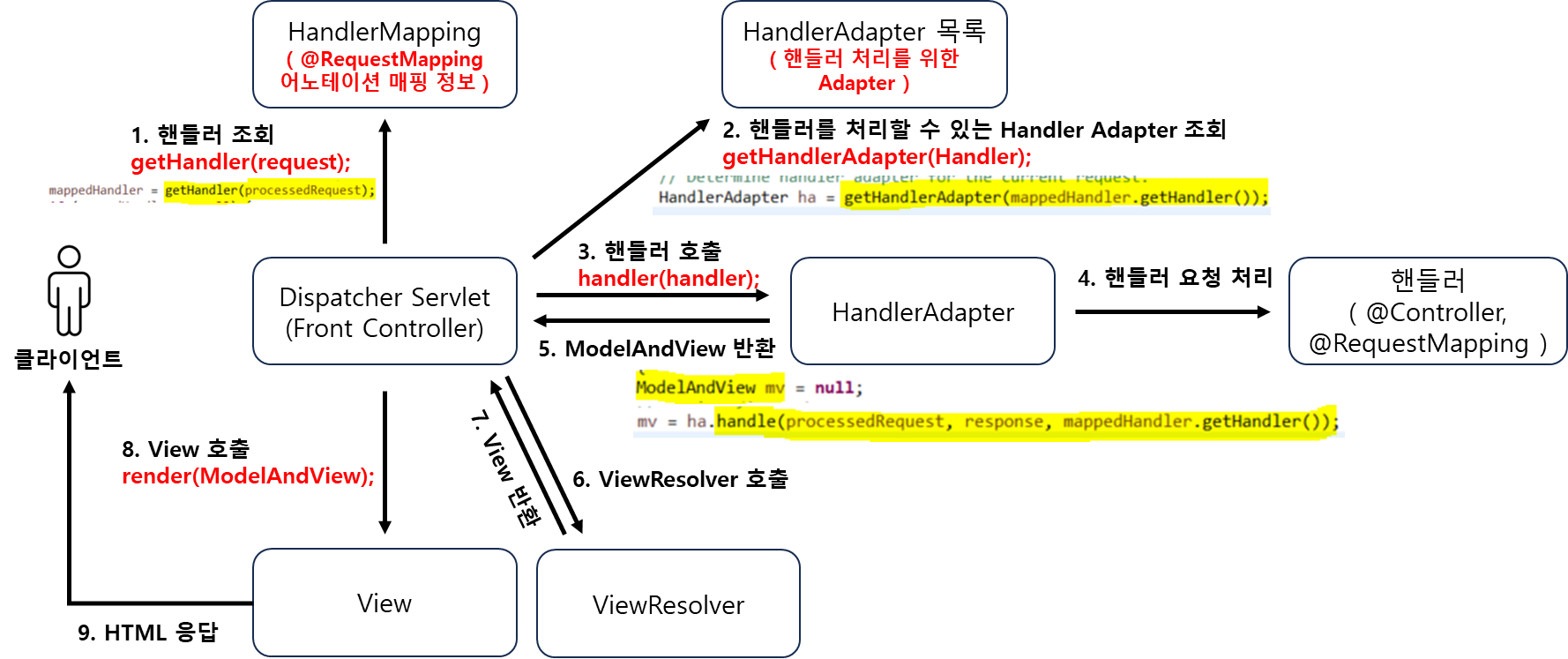 6~8. processDispatcherResult(), render() 메서드를 호출하여 View 객체 생성 후 HTML 반환한다.