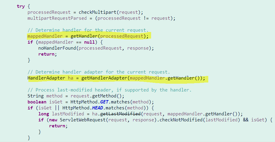 doDispatch() 메서드에서는 getHandler(HttpServletRequest) 메서드를 통해 적절한 Handler 를 찾는다.