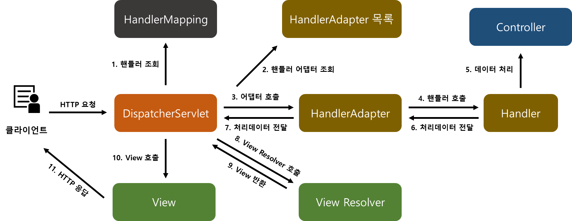 이러한 Handler 들을 매핑시킨게 DispatcherServlet 에 의해 적절한 Controller 를 찾는 HandlerMapping 이다.