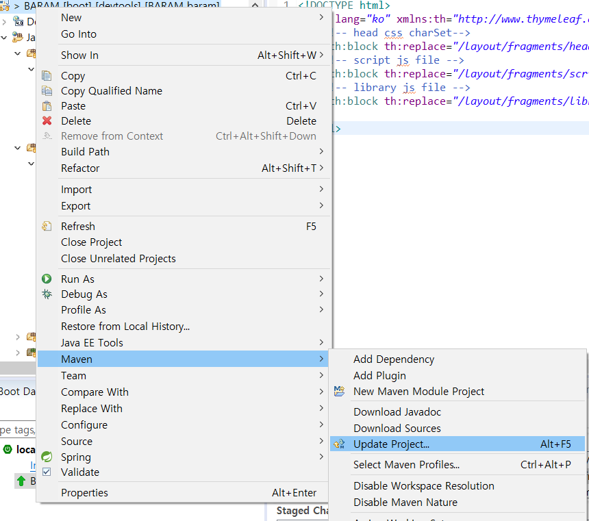 pom.xml에 thymeleaf dependency 를 추가했으므로 의존성 및 필요한 라이브러리를 추가하기 위해 Maven update 실행
