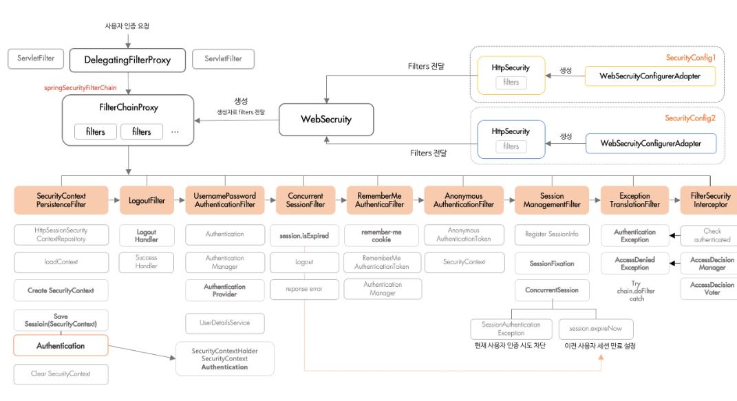 사용자의 요청이 들어오면 서블릿 컨테이너에서 생성되고 실행되는 DelegatingFilterProxy 가