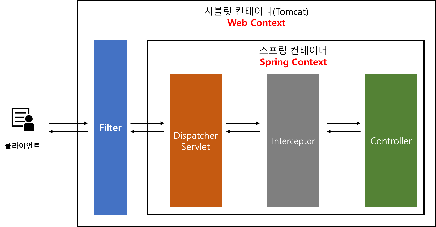 하지만 Filter 들은 Servlet Container 에서 동작하는걸로 알고 있지만